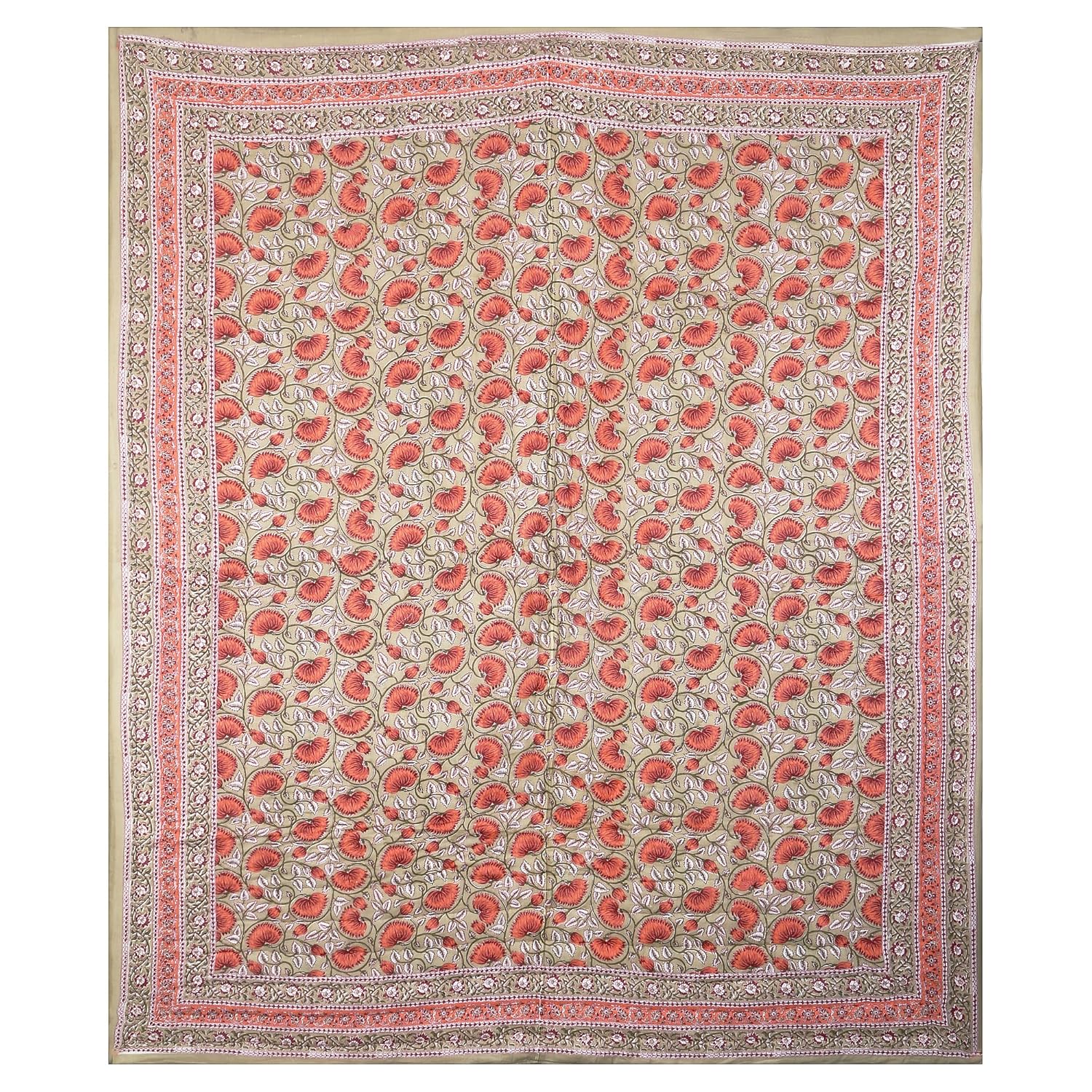 PREMIUM ORGANIC COTTON ANTIQUE SUNSET ORANGE BEDSHEET WITH EMPIRE PLANT BLOCK PRINT – ETHNIC ELEGANCE